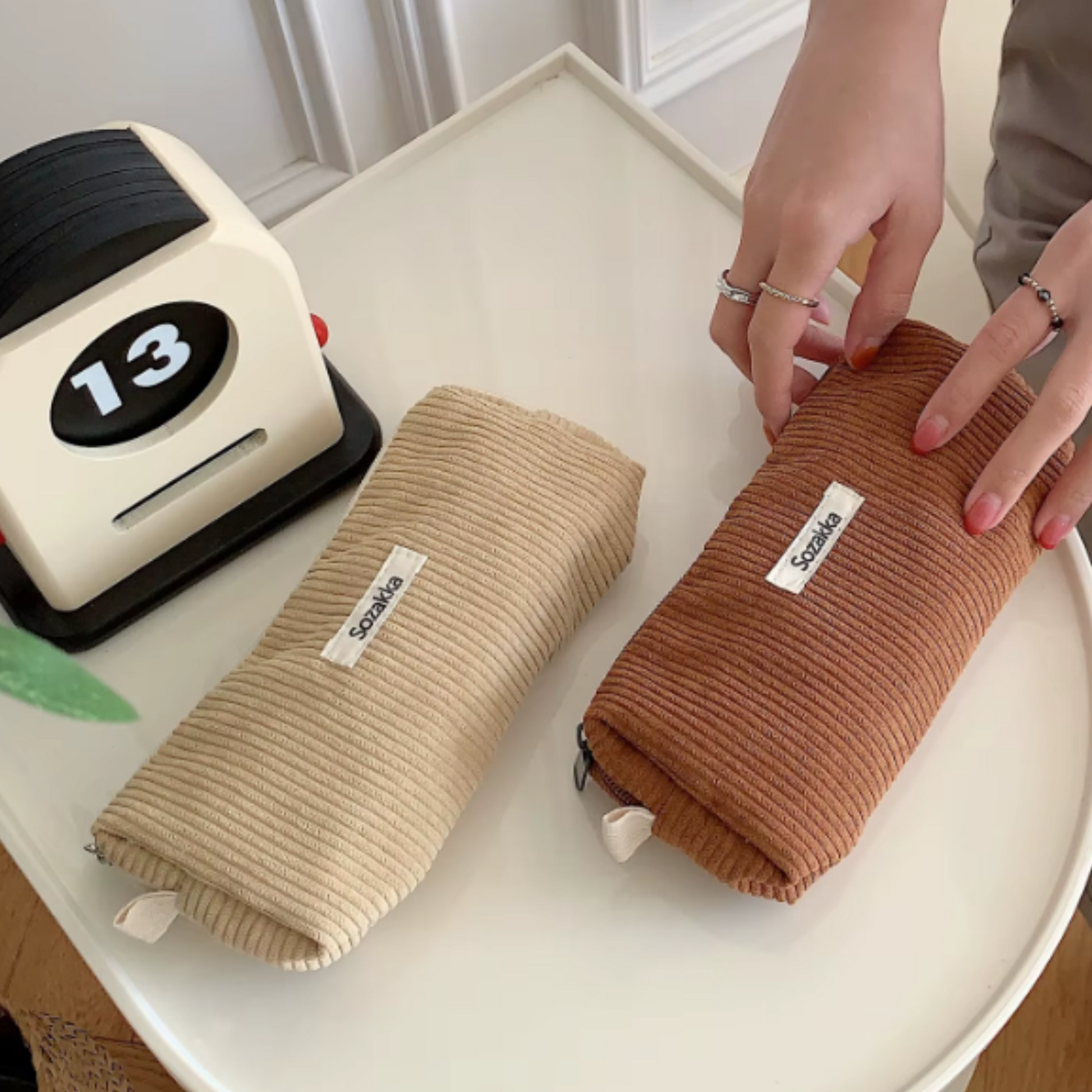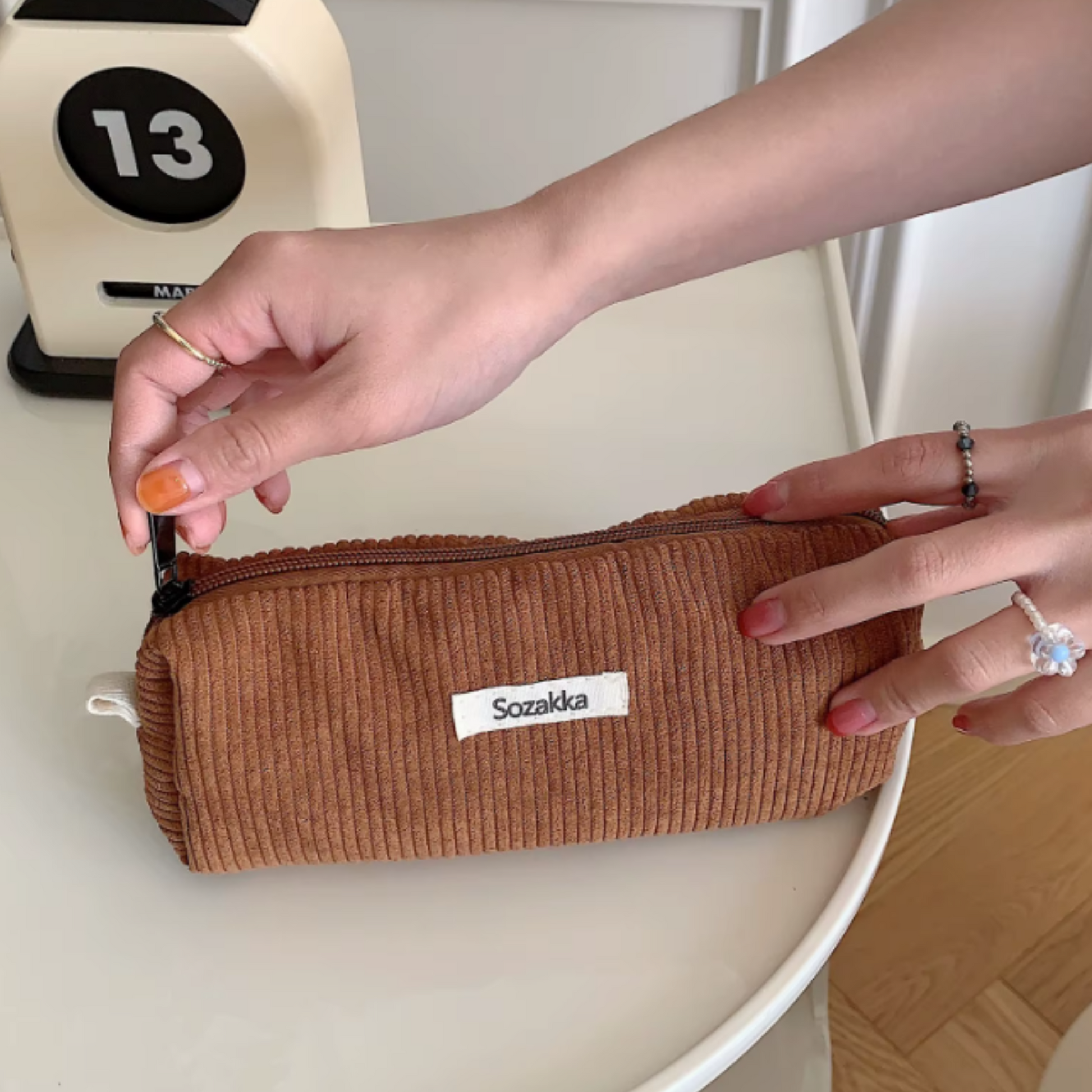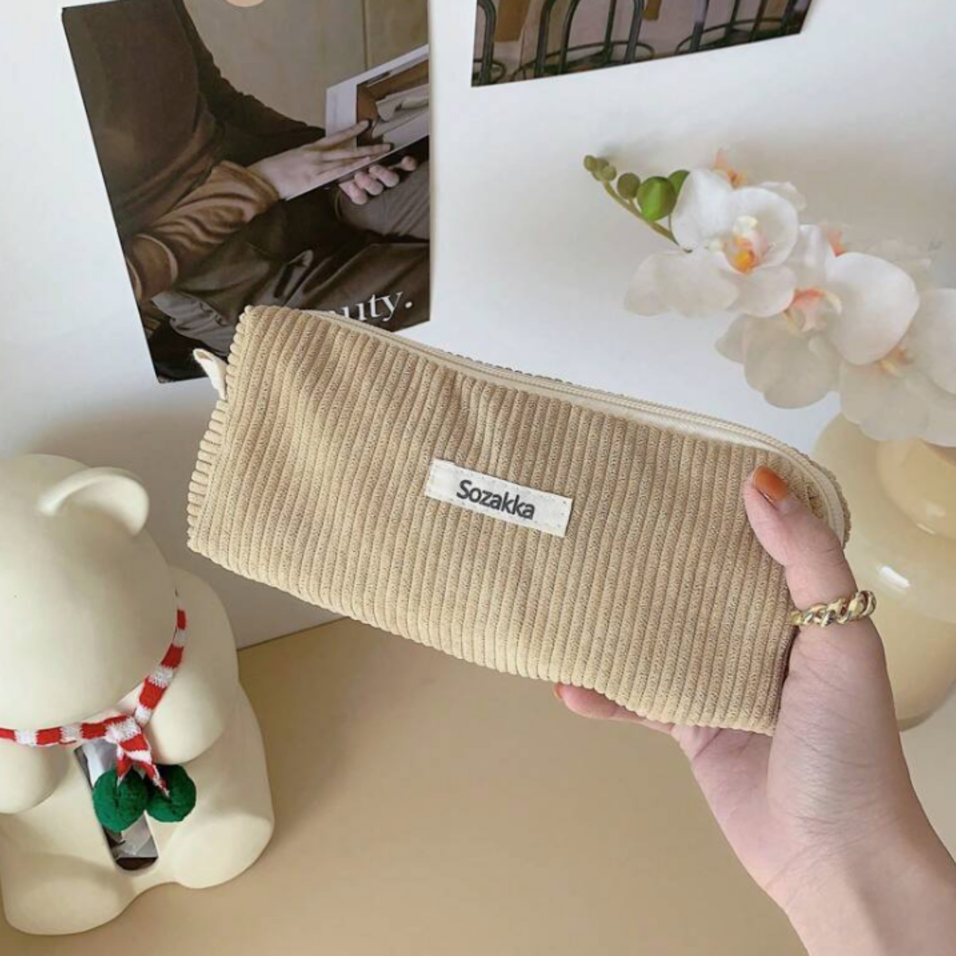 Alliant style et fonctionnalité, cette trousse apporte une touche chaleureuse à votre espace en offrant un rangement pratique pour stylos et petits accessoires.